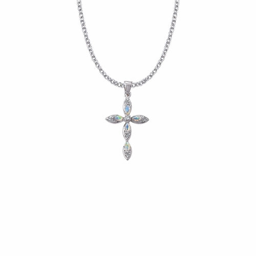1-1/8 Inch Sterling Silver Pointed Oval Ends Cross Necklace with Opal Stones