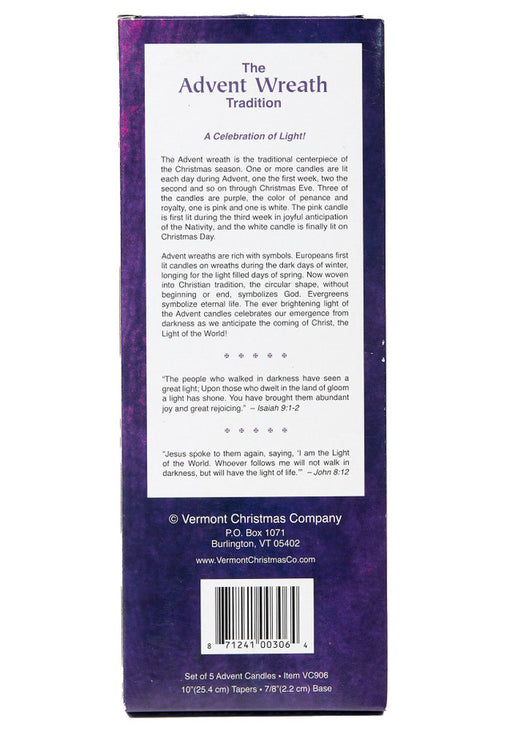 Vermont Christmas Company10" wax tapers3 purple, 1 pink, 1 whiteMade in U.S.A.