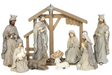 This 10 piece nativity set includes nine figures and one rustic style creche with silver glittered star. Figures have beautiful detail throughout, especially in the folds of the robes. Wise Men's crowns and gifts are a silver tone. Tallest figure is 8"; size of creche is 10" wide x 9 5/8" high x 2 1/2" deep; figures and creche are made of resin.
