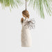 - 4”h hand-painted resin ornament of a female angel in cream dress with wire wings, with hands in prayer position; tree carving on angel's dress.