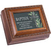 This mini size keepsake box is perfect for Baptism jewelry or other small items. Features a hinged lid that's also a photo frame. Comes with attractive art print, under glass, that reads: "Baptism - May the love & grace of God always be with you now and forever." Print can be changed out for a favorite photo trimmed to 2 1/4" x 3 1/4"; frame has removable back under lid. Outside is finished in a woodgrain tone with beaded trim on lid. Inside is lined in black velvet. Bottom is fabric padded to protect furniture. Box is made of a super-sturdy polymer that resists cracking and chipping. Overall size is 4 1/2" x 3 1/2" x 2".