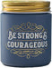 - Faith Inspired Bible Verse Candle for the Home: The encouraging jar candle features a sturdy, frosted navy blue glass & shiny, golden foil scroll design bordering a Scripture sentiment from Joshua 1:9 in a bold white font on the front: "Be strong & courageous." A secure, easy screw-on & off gold metal lid ensures the candle fragrance stays nice & fresh while not in use and features a blue sticker on top, repeating the Bible verse message.
