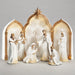 This ivory nativity set brings traditional beauty and reverence to your Christmas décor. Sculpted in resin with smooth contours and shimmering gold dot accents, each figure radiates timeless charm. The included triptych-style backdrop adds sacred architecture to the scene, framing the Holy Family in graceful arches. An ideal display for mantels, tabletops, or devotional spaces.