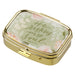 A delicate light green background covers the lid of this pillbox, which is decorated with an intricate pink and white floral pattern with yellow accents. Epoxy covers the design and creates a charming antique feel. The hand-painted style of the blossoms adds elegance to the design, and the sentiment is displayed on the center of the lid in a dark green cursive script.