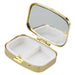 The pillbox features a polished gold exterior with a smooth, engraved diamond pattern on the base that adds an elegant touch. A secure clasp keeps the contents safely tucked inside, while a small mirror on the underside of the lid lets you check your makeup or freshen up throughout the day. Inside, a white insert is divided into two compartments—ideal for storing pills, vitamins, mints, small candies, or even jewelry. This compact pill case for women is discreet and slips easily into a pocket, purse, or travel bag, and the flexible latch makes it simple to open and close on the go.