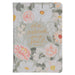 The Bible's hardcover is wrapped in a beautiful lichen gray faux leather with soft blush pink and white flowers with golden centers that weave together with lush green foliage around the gold-foiled sentiment.