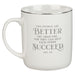 The first mug has a white exterior, a silver metallic rim, and a silver geometric design on the interior. The sentiment on the front is silver-foiled.