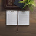 The edges of the devotional are secured with brown topstitching, and a brown ribbon marker is attached to the spine to guide your reading. A brown foliage design spreads across the top of each page, and a full-page brown tree design announces each new month.