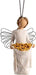 - 4”h hand-painted resin angel with wire wings in cream dress, holding up skirt filled with yellow sunflowers. Hook and loop affixed to figure’s head
