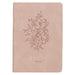 The back cover displays a smaller, heat-debossed version of the same floral design. Light pink topstitching reinforces the journal cover on both the front and back, and a pink satin ribbon marker attached to the spine keeps your place. The 336 lined pages inside the journal present a Scripture verse at the bottom of the page that you can use as a prayer prompt or for memorization, and they are beautifully gilt-edged in gold.